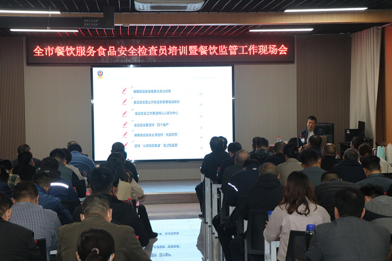 為進一步豐富餐飲服務(wù)食品安全檢查員業(yè)務(wù)知識,提升全市餐飲環(huán)節(jié)食品安全監(jiān)管水平,棗莊市市場監(jiān)督管理局根據(jù)2023年餐飲監(jiān)管工作計劃,于11月8日,在臺兒莊古城學(xué)校召開全市餐飲監(jiān)管工作暨餐飲服務(wù)食品安全檢查員培訓(xùn)會議,市、區(qū)兩級局分管局長、餐飲科全體人員、全市餐飲服務(wù)食品安全檢查員參加。會議由市市場監(jiān)管局副局長張衍耀主持;臺兒莊區(qū)委常委、副區(qū)長孫作偉致辭,并介紹建設(shè)“食安臺兒莊”的經(jīng)驗和做法;山東省市場監(jiān)管局餐飲處一級調(diào)研員遲玉聚博士,作《深刻學(xué)習(xí)領(lǐng)會習(xí)近平總書記重要論述精神努力守住食品安全底線》主題報告。